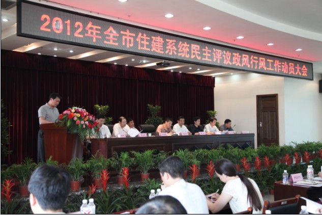 5月17日,市住建委召開全市住建系統(tǒng)民主評議政風(fēng)行風(fēng)工作動員大會,市住建委黨委書記、主任楊劍作動員報(bào)告,并出臺評議方案。圖為市供水總公司總經(jīng)理陳衛(wèi)國作表態(tài)發(fā)言。
