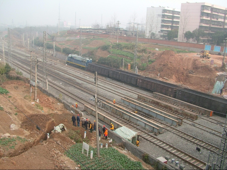 經(jīng)供水公司與鐵路部門協(xié)調(diào),武漢鐵路局、武鐵設(shè)計院、西南設(shè)計院擬訂采用架空項進法穿越焦柳鐵路線5股道,定制鋼筋砼套管,管節(jié)間采用鋼板內(nèi)漲圈接口。在調(diào)查鐵路信號、通信光電纜徑路及數(shù)量,在確保鐵路運輸安全的原則下進行防護設(shè)計。武漢鐵路局工務檢測所編制施工圖。項目委托武鐵江騰公司具體施工。供水公司則完成穿管、銜接施工。
