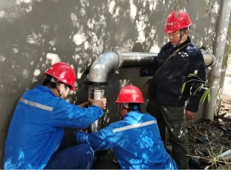 圖為工作人員在安裝出水管道