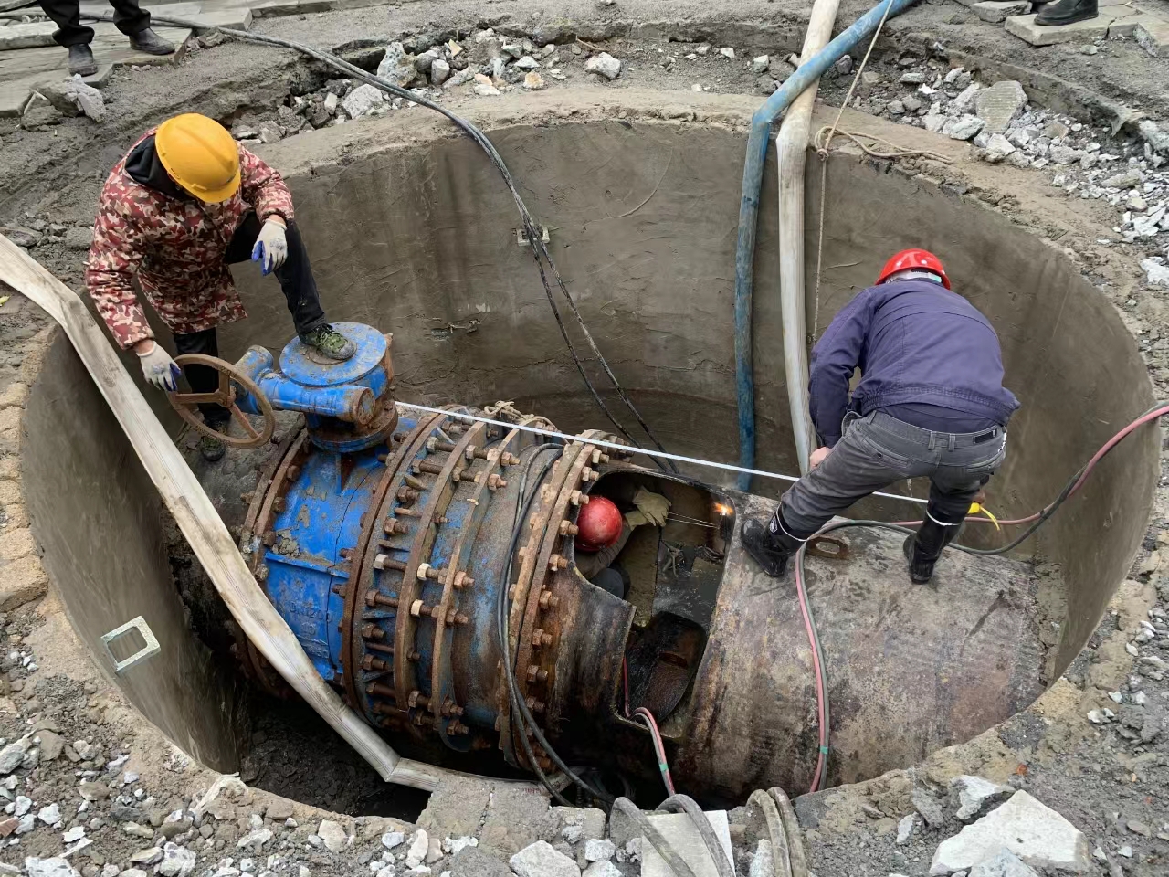 停水搶修主要包括廠站停泵、倒閥、排水、施工、沖洗、消毒、恢復(fù)供水等過程,供水管徑越大、輸水距離越長,總耗時越久。此處節(jié)點性閘閥為中心城區(qū)供水管網(wǎng)“大動脈”,系主要輸水管線之一,DN1200管道的停水搶修波及范圍廣、排水時間長、焊接難度大。為全力縮短停水時間,減少停水范圍,集團多部門聯(lián)動,最大限度保障市民生產(chǎn)生活用水。