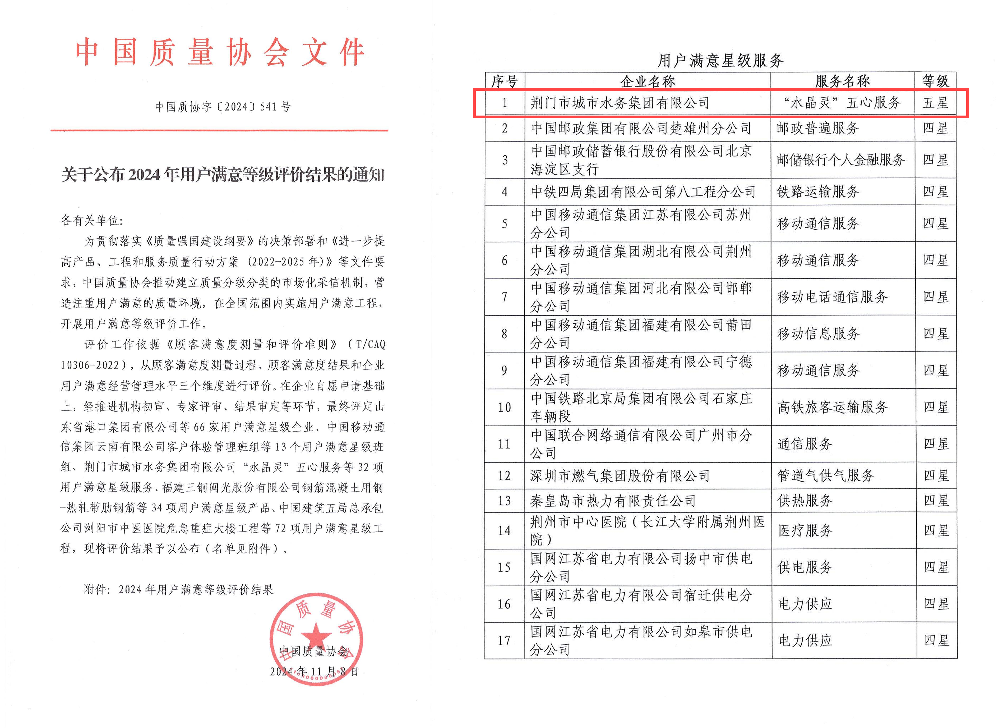 11月8日,中國質(zhì)量協(xié)會(huì)公布2024年用戶滿意等級(jí)評(píng)價(jià)結(jié)果,荊門市城市水務(wù)集團(tuán)有限公司(以下簡稱“集團(tuán)”)以“水晶靈”五心服務(wù)模式為特色,成為全國唯一一家獲評(píng)服務(wù)類五星的企業(yè),標(biāo)志著在供水服務(wù)領(lǐng)域已經(jīng)成為全國標(biāo)桿。