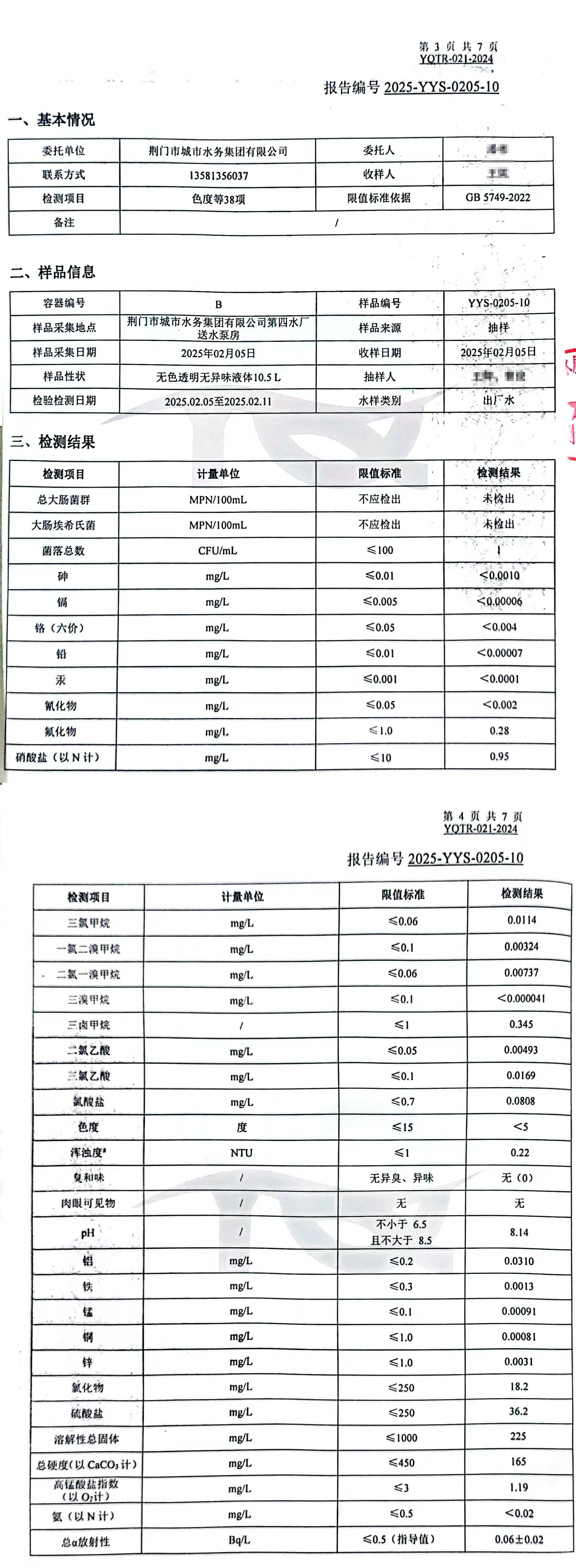 2025年2月,集團(tuán)委托具有CMA認(rèn)證資質(zhì)的第三方檢測(cè)機(jī)構(gòu),依據(jù)《生活飲用水衛(wèi)生標(biāo)準(zhǔn)》(GB5749-2022)對(duì)“四廠一站”出廠水、管網(wǎng)末梢水進(jìn)行全分析檢測(cè),水質(zhì)合格率100%。依據(jù)《地表水環(huán)境質(zhì)量標(biāo)準(zhǔn)(GB3838-2022)》檢測(cè)漳河原水,檢測(cè)結(jié)果為符合Ⅱ類標(biāo)準(zhǔn)。
