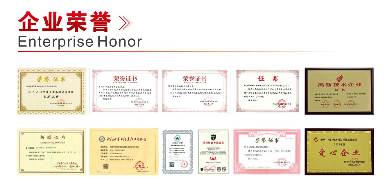 連續(xù)十五年獲評(píng)省市級(jí)“守合同 重信用”單位的榮譽(yù)稱號(hào),連續(xù)十三年榮獲ISO三體系認(rèn)證證書(shū),連續(xù)五年榮獲水利部頒發(fā)的全國(guó)水利建設(shè)市場(chǎng)主體信用等級(jí)AAA級(jí)證書(shū)。先后被國(guó)家、省、市主管部門授予全國(guó)企業(yè)征信系統(tǒng)立信單位、省市水利系統(tǒng)先進(jìn)施工企業(yè)、先進(jìn)基層黨組織、安全生產(chǎn)先進(jìn)單位等榮譽(yù)稱號(hào)。