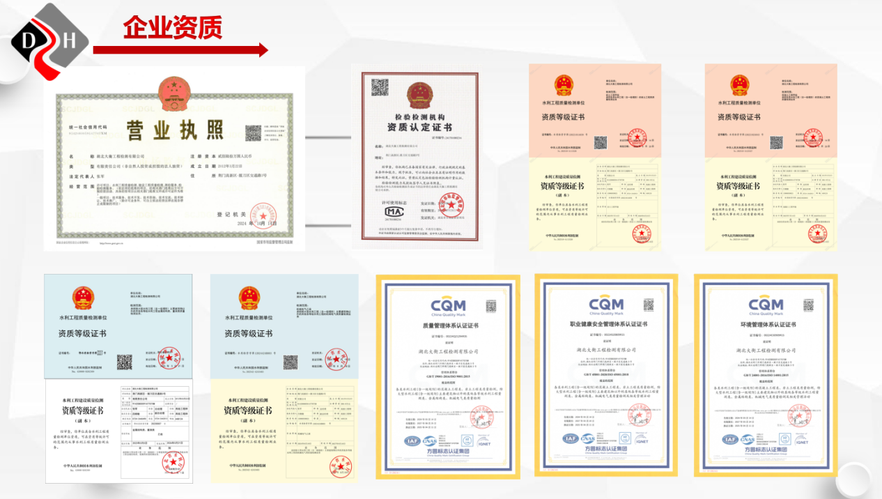 大衡公司持有湖北省市場監(jiān)督管理局評審中心頒發(fā)的CMA計量認(rèn)證證書(共340項參數(shù)),具有水利工程檢測資質(zhì)巖土、混凝土甲級;量測、金屬結(jié)構(gòu)和機(jī)械電氣類乙級。業(yè)務(wù)范圍涵蓋水庫除險加固、灌區(qū)續(xù)建配套與節(jié)水改造、泵站更新改造、堤防工程、河道治理、農(nóng)村安全飲水、土地復(fù)核等多個領(lǐng)域,連續(xù)四年承擔(dān)湖北省水利廳水利工程飛檢任務(wù),以誠信經(jīng)營與專業(yè)服務(wù)樹立行業(yè)口碑。