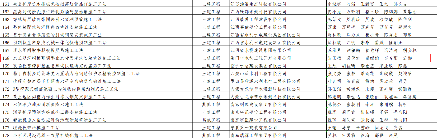 近日,中國水利工程協(xié)會公布了2025年度水利行業(yè)工法名單,荊門市城市水務集團有限公司下屬單位荊門市水利工程開發(fā)有限公司(以下簡稱“荊門水發(fā)”)申報的“水工建筑鋼??烧{(diào)整止水帶固定式安裝快速施工工法”順利通過評審,正式被確認為中國水利行業(yè)工法,為水利工程標準化、高效化建設(shè)提供了有力支撐。