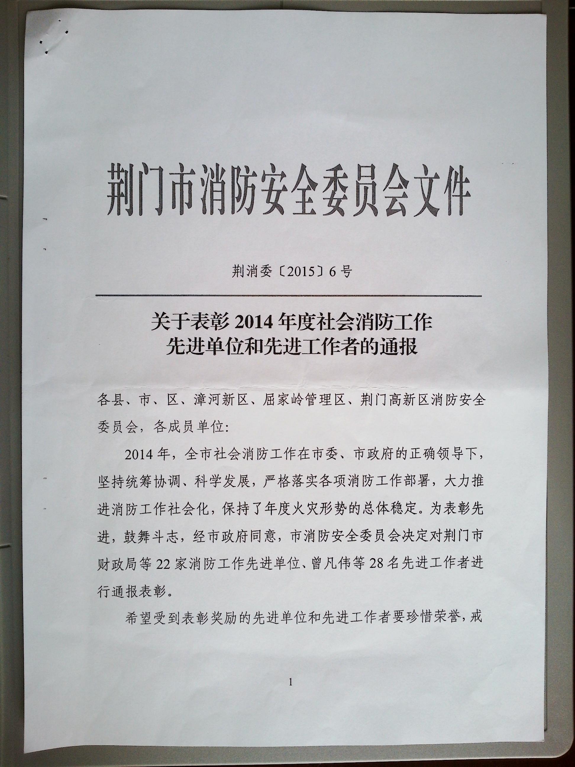 榮譽快訊;公司獲2014年度消防工作先進單位