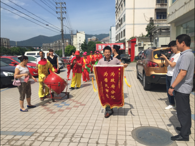 7月31日,虎牙關(guān)社區(qū)和用戶代表組織腰鼓隊到總公司送錦旗致謝。據(jù)悉,掇刀城南新區(qū)金苑大市場主、分水管網(wǎng)嚴重老化,水管破損而致停水。市供水總公司客服部門快速勘測報裝,維修處迅速組織施工,并調(diào)派應(yīng)急供水車在改造期間為商戶送水。