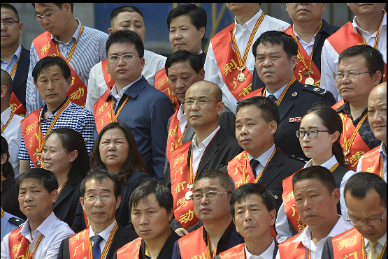 荊門(mén)市勞動(dòng)模范、供水總公司黨委書(shū)記、總經(jīng)理陳永根(右二)上臺(tái)接受頒獎(jiǎng)。