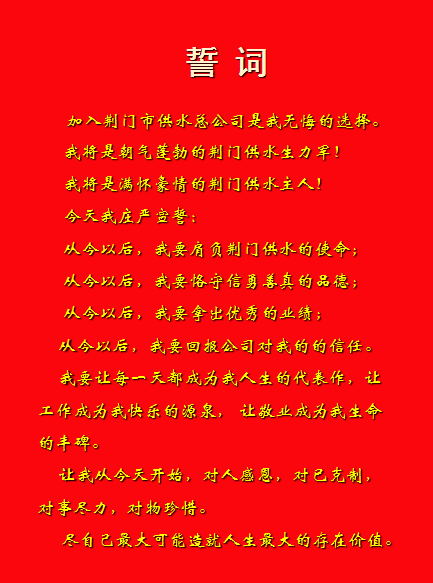 為進(jìn)一步激發(fā)供水人做好本職工作的榮譽(yù)感、使命感和責(zé)任感,11月9日下午,市供水總公司在五樓會(huì)議室首次舉行新進(jìn)員工入職宣誓儀式,讓他們用誓言表達(dá)對(duì)企業(yè)、對(duì)供水職業(yè)的忠誠(chéng)。