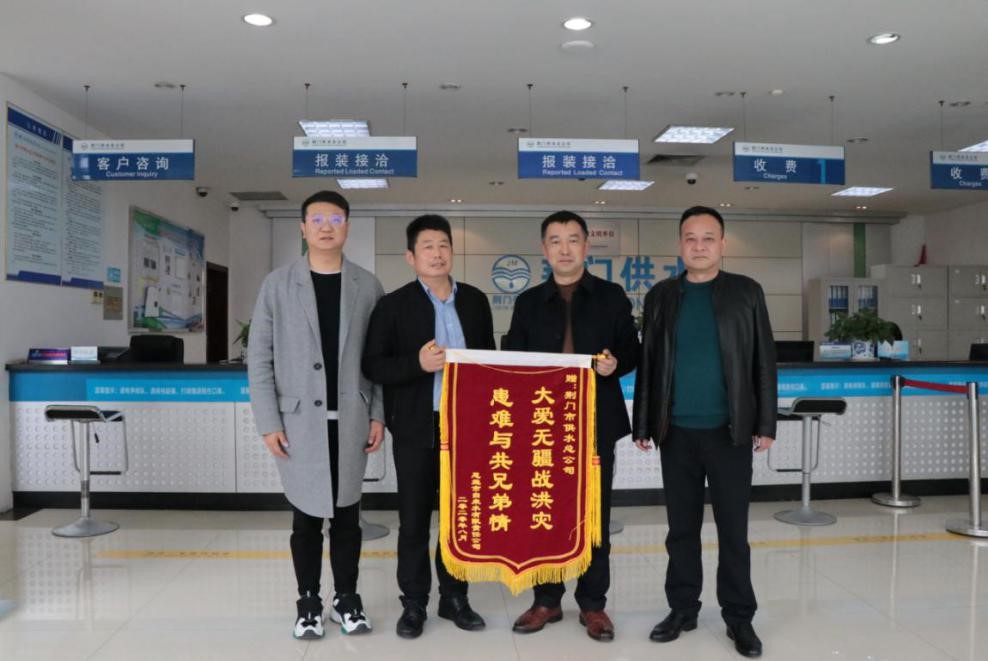 11月20日上午,恩施市自來(lái)水公司總經(jīng)理袁進(jìn)一行6人專(zhuān)程趕到荊門(mén),向市供水總公司在恩施遭遇五十年一遇特大洪澇災(zāi)害的危難時(shí)刻給予傾情付出和無(wú)私幫助表示感謝,并贈(zèng)送寫(xiě)有“大愛(ài)無(wú)疆戰(zhàn)洪災(zāi) 患難與共兄弟情”的錦旗。