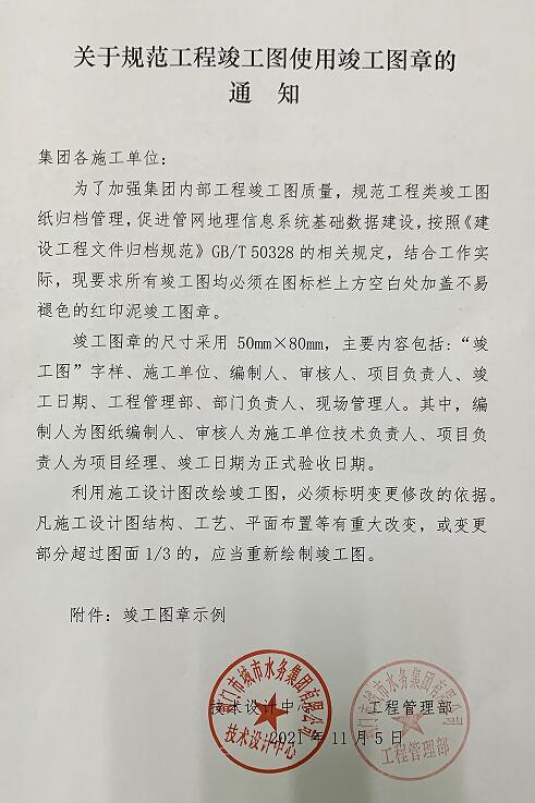 近日,技術設計中心為了加強集團內(nèi)部工程竣工圖質量,規(guī)范工程類竣工圖紙歸檔管理,促進管網(wǎng)地理信息系統(tǒng)基礎數(shù)據(jù)建設,聯(lián)合工程管理部編發(fā)了規(guī)范工程竣工圖使用竣工圖章的要求和指導意見。